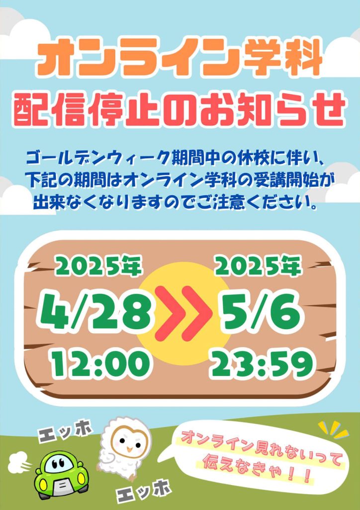 ゴールデンウィークの休校に伴い、一定期間オンライン学科の受講を開始する事が出来ません。ご注意ください🙇