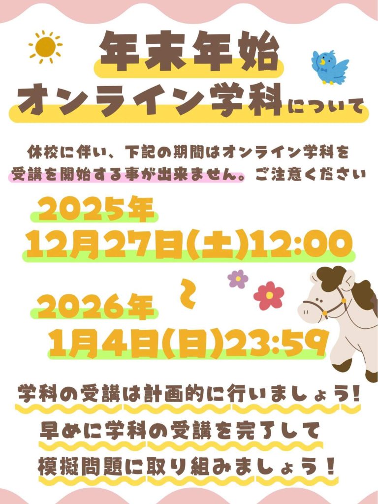年末年始の休校に伴い、一定期間オンライン学科の受講を開始する事が出来ません。ご注意ください🙇