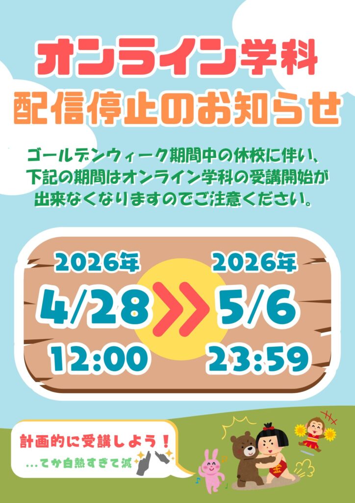 ゴールデンウィークの休校の期間オンライン学科の受講ができません。🙇