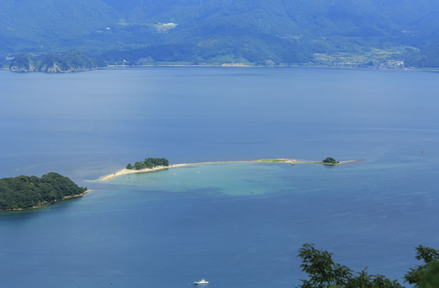 透明度の高い水質と白砂が魅力の無人島・水島。海水浴期間中は、毎日運行している渡し舟に乗って島へと渡ることができます。
